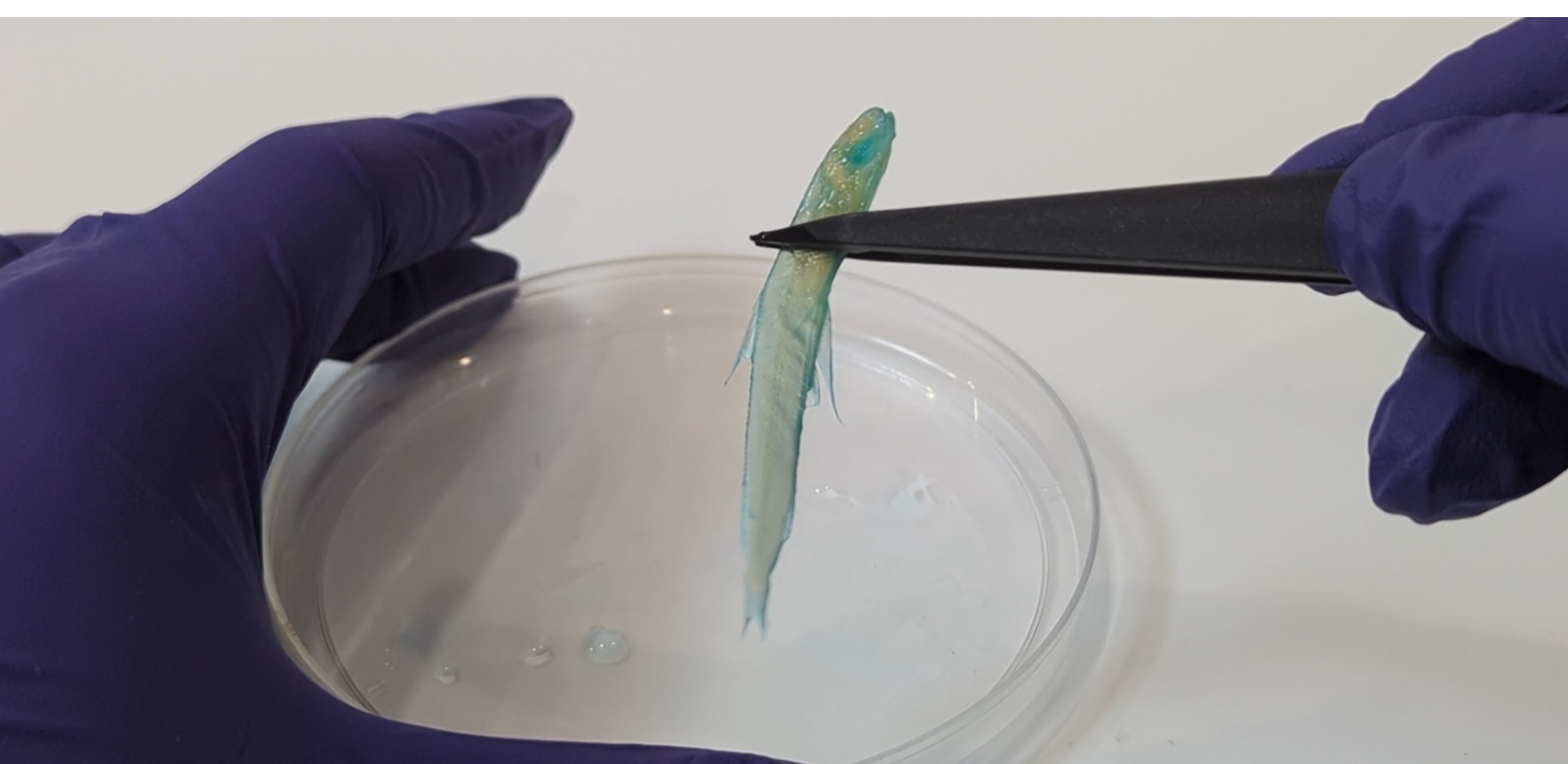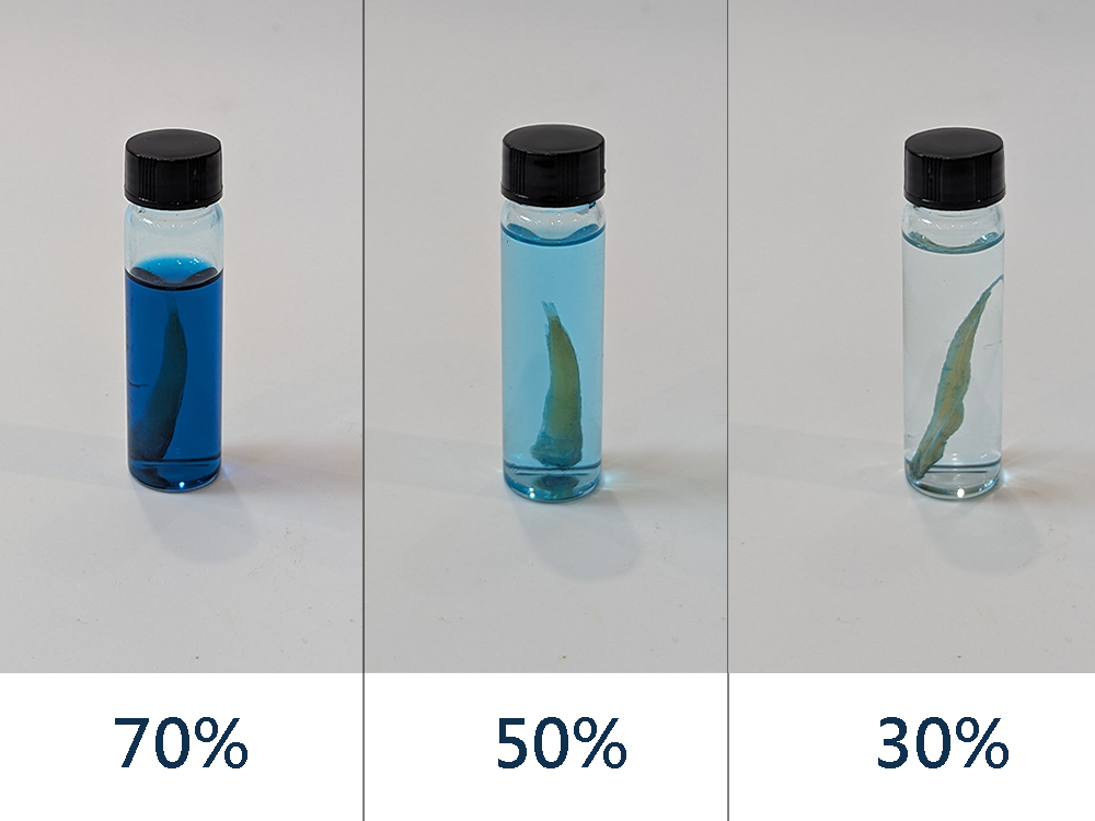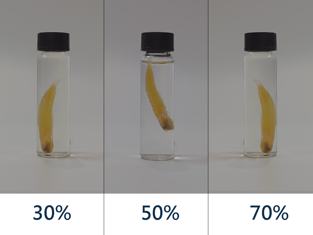 染色階段結束後,要讓標本體內從高濃度酒精變回水,同樣不能著急,再次利用濃度的變化從高濃度酒精慢慢轉變成低濃度酒精再變回純水分。這個階段可以觀察到帶有染劑的酒精顏色隨著濃度逐漸變淡,但是標本身上的藍色變化較小。