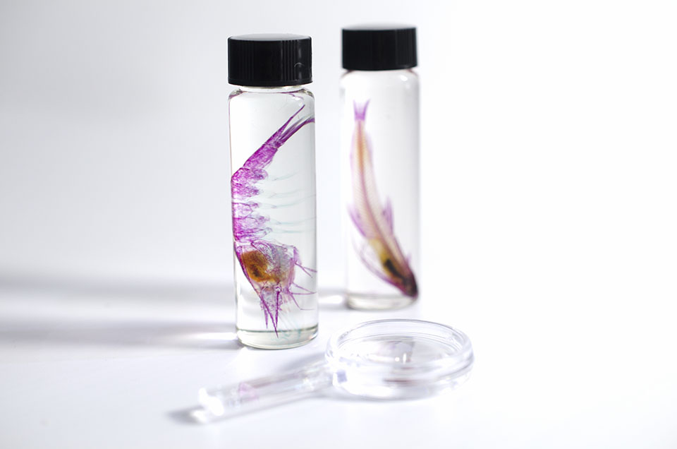 透明生物標本是一種獨特的生物標本製作方法,最先是用於科學研究用途,生物死亡後,在不破壞生物體完整的情況下,使用多種藥劑包含酒精、氫氧化鉀、酵素、染劑,經過染色與肌肉透明化過後,保存於甘油之中。不同的生物結構都有所差異,再加上製作標本的過程與環境等變因,每個人製作出來的標本都會有所不同,這也是每個透明生物標本都是世上獨一無二的,就和你我相同。