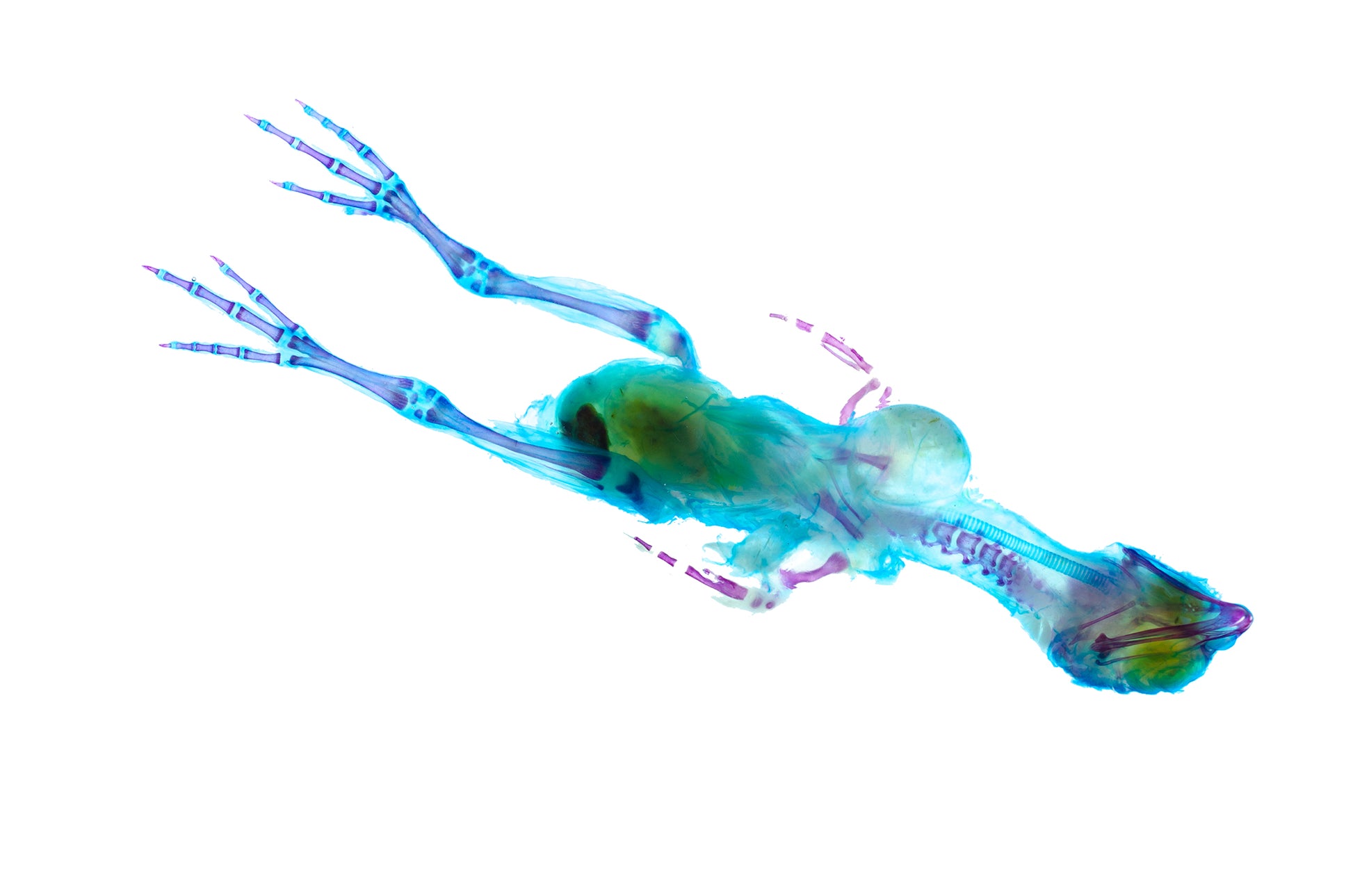 【桌上的迷你博物館】 透明標本展現了生物獨特的骨骼構造,經過染色技術,紅色的硬骨與藍色的軟骨清晰可見。適合放置於書桌或書架,利用被廢棄或自然死亡的標本再生作成標本,是兼具科學教育與工藝美感的獨特收藏。